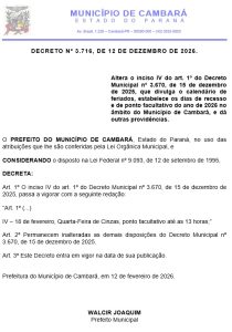 A Administração Municipal de Cambará informa que foi realizada alteração no Decreto nº 3.670/2025, que divulgou o calendário oficial de feriados, recessos e pontos facultativos para o ano de 2026 no âmbito do Município.